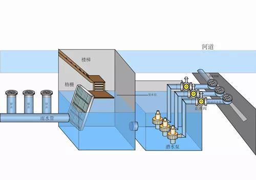 雨水泵站由雨水收集井、进水管、格栅、集水池、水泵、排水管道组成,主要功能是收集地势低洼区域内的雨水、地下水、提升到标高的雨水管网,最终排入河道。