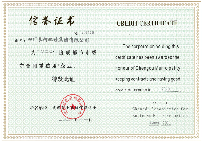 四川长河环境集团继荣获2021年度四川省“诚信企业”、成都高新区“瞪羚企业”后,再增“成都市守合同重信用企业”荣誉称号!这既是政府部门对长河环境集团在合同履约及企业诚信建设中所取得成绩的肯定,更是对长河环境集团继续砥砺前行的一种鼓励和期盼。