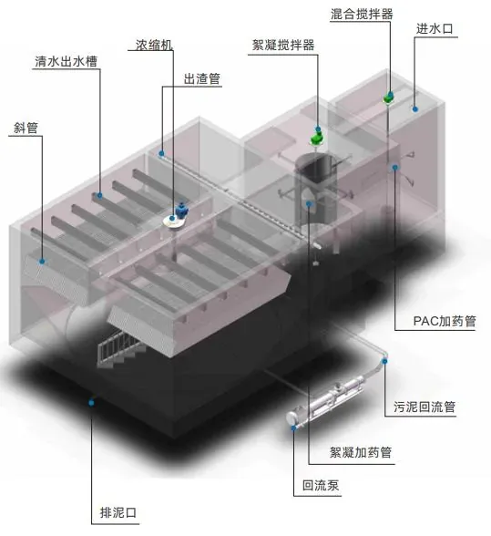 4、集水槽收集澄清水,污泥沉积到底部,浓缩后的污泥一部分回流到絮凝池,一部分作为剩余污泥排出。